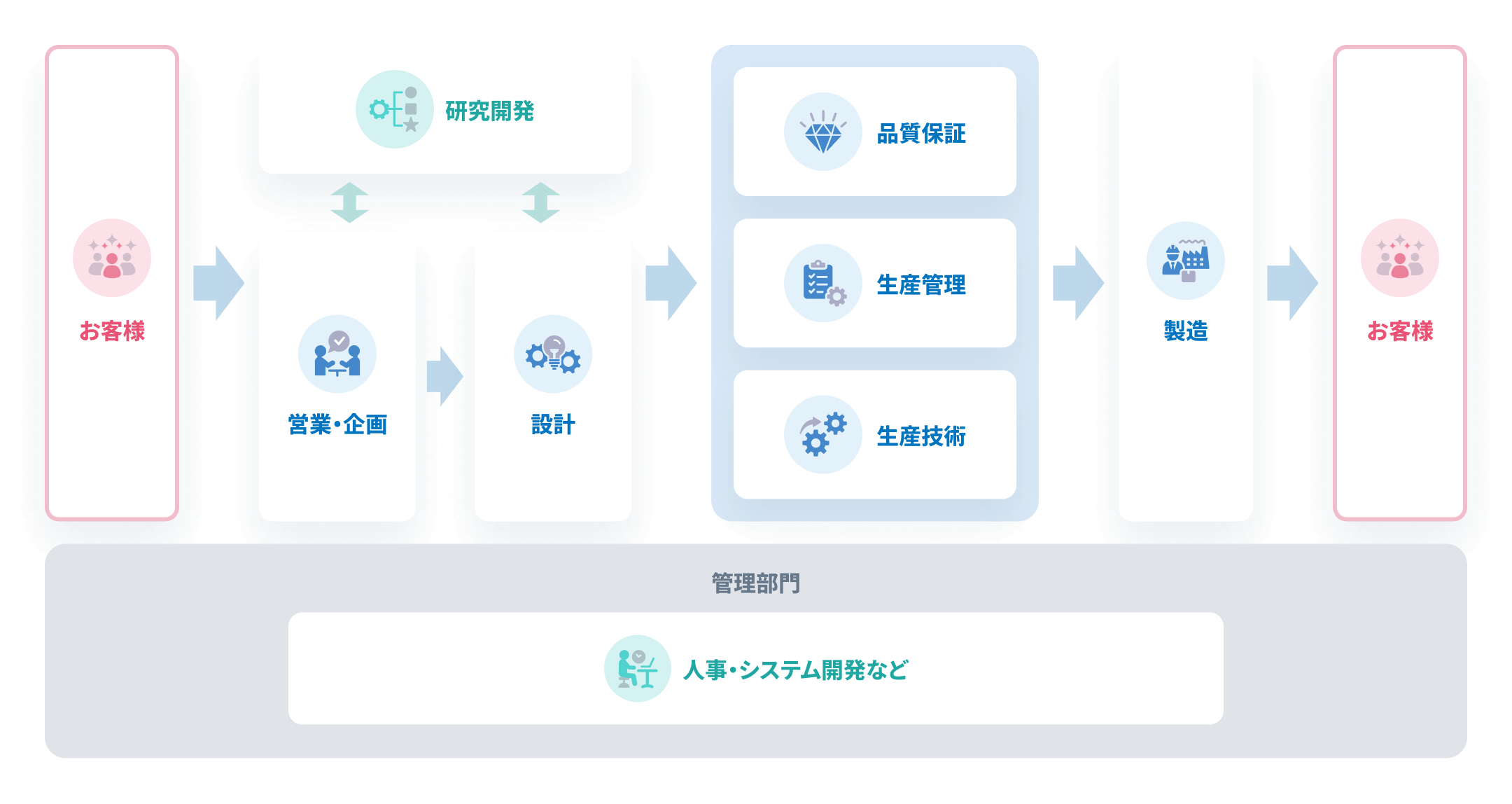 SMKの製品がお客様の元に届くまでのビジネスフローを通じて、各職種の役割を紹介します。