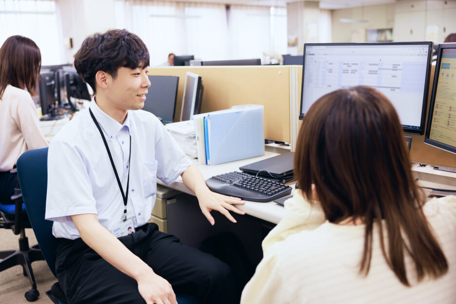 私の部署は業務が幅広く、「パソコン·データ関係で困ったときに頼る便利屋さん」といった仕事だと思っています。自分自身も担当する業務はバラエティに富んでいますが、メインの仕事は社内のグループウェアと他のシステムを連携して、より便利にする方法を考えて実現することです。他部署から要望を受けて、どういった目的で何がしたいのかを聞き取り、技術面の実装をする業務と、新システムの運用ルール作りや周知活動など、新システムを使ってもらうための活動をしています。